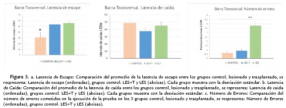 Barra trasversal. La prueba de Anova para la comparación de grupos demostró una diferencia significativa para la variable latencia de escape (LE), F(2, 25gl) = 7,45, p<0,003. El grupo control intacto tuvo un desempeño superior al grupo LES+T, p<0,002 y p<0,03 respectivamente. Mientras que la latencia de caída (LC), no reveló diferencia entre grupos, si se observó diferencia entre el número de errores (NE) en la realización de la prueba entre los diferentes grupos, F(2, 25gl) = 2, p<0.001. Los animales controles intactos y trasplantados tuvieron un comportamiento similar, alejado del desarrollado por el grupo de animales lesionados (Figs 3a, 3b y 3c).