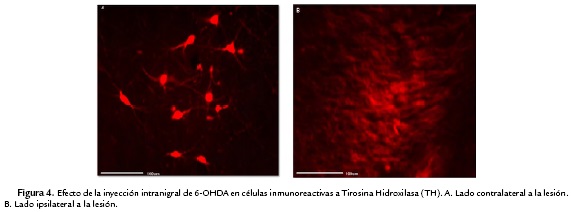 Comprobación del modelo de Hemiparkinsonismo. La lesión unilateral en el hemisferio derecho por inyección intracerebral de la neurotoxina 6-OHDA, produjo una pérdida drástica (p<0,001) de cuerpos celulares inmunoreactivos a la enzima TH alrededor del sitio de inyección de la (Fig. 4).
