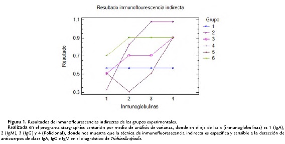 Se realizó un análisis de varianza de los datos obtenidos con el programa Stargraphics Centurion. En el ANOVA simple teniendo como variable dependiente larvas y como factor, los grupos de tratamiento se realizaron 180 observaciones, presentando un p<0.05 mostrando que es estadísticamente significativo, con un nivel de confianza del 95 %, mostrando que el diagnóstico con inmunoflourescencia para Trichinella spiralis es altamente significativo y puede utilizarse como diferencial de otros tipos de parasitosis.