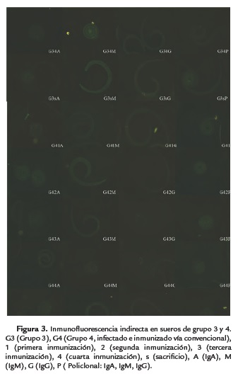 Los sueros analizados del grupo 4, fueron principalmente positivos desde la primera inmunización hasta el sacrificio, con cada una de las inmunoglobulinas, con excepción de la 1ra inmunización después de la infección con la inmunoglubilina IgA, manteniéndose la respuesta inmunitaria después de la infección debido a la estimulación de las inmunizaciones subsecuentes (Fig. 1 y 2).