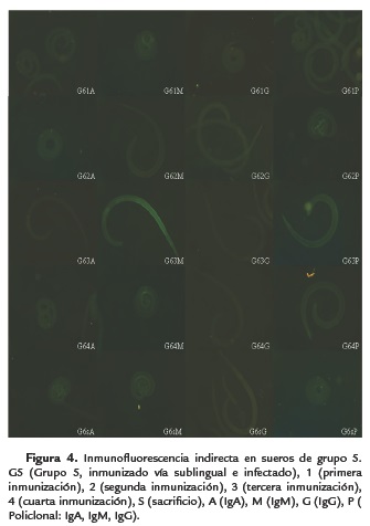 La exclusión inmune representa la primera línea de defensa contra helmintos intestinales y se refiere a la protección de la superficie de la mucosa por medio de anticuerpos (IgA e IgM de secreción) y otros factores innatos (Contreras, 2001), por lo cual en el presente trabajo la vía de administración sublingual presentó una mayor protección contra la infección por T. spiralis y por medio de inmunofluorescencia se puede apreciar que a partir de la tercera inmunización vía sublingual hay una presencia de IgA anti-T. spiralis, ya que en trichinellosis la respuesta humoral y celular especifica del hospedero se desarrolla así los diversos estadios del ciclo de vida del parásito. Este se manifiesta a nivel intestinal como una respuesta inflamatoria que causa la expulsión del parásito, y a nivel muscular como la formación de infiltrados celulares (Alcantara y Correa, 1996), por lo cual podemos referir que la disminución de la carga parasitaria fue debida al aumento de inmunoglobulinas en mucosas. Takashashi et al. (1995) menciona que en el humano está comprobado que los antígenos de respuesta lenta, son detectados por anticuerpos de la clase IgM, mientras que antígenos de respuesta rápida por la clase IgG, aumentándose ambas en el presente trabajo.