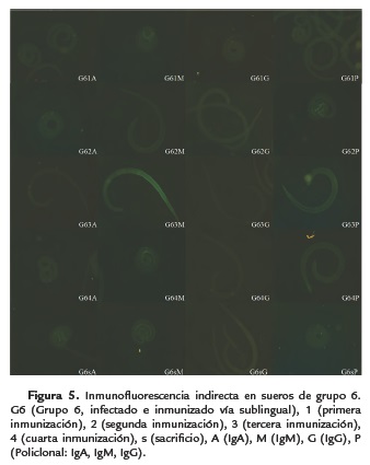 A diferencia del grupo cuatro (infección e inmunización parenteral), en el grupo seis (infección inmunización sublingual) no se identificó la interacción antígeno anticuerpo con IgA en la primera inmunización, siguiendo el mismo patrón con IgM, IgG y policlonal en los diferentes tiempos de inmunización (Fig. 1 y 5 ), dando positivos en cada uno.
