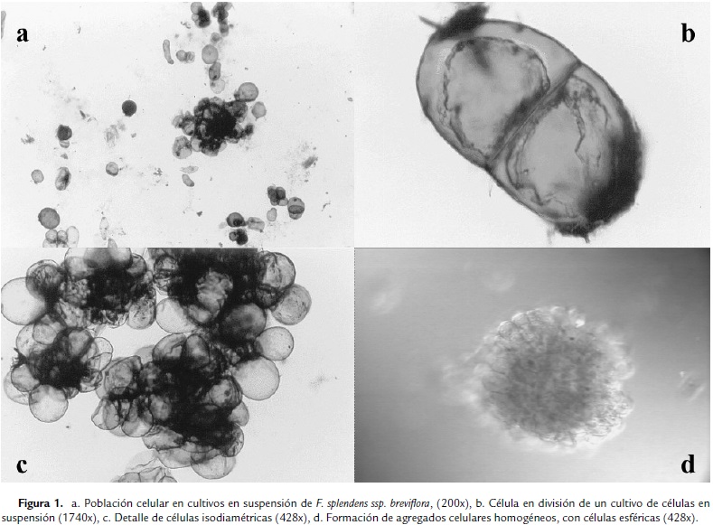 Los cultivos de células de Fouquieria splendens ssp. breviflora, mostraron un conjunto celular muy homogéneo en esta condición de estrés (Figs. 1a, 1b, 1c y 1d), característico de la curva de crecimiento de un cultivo: células alargadas o tubulares, isodiamétricas y gigantes, repartidas en cada fase; primero células tubulares (o elongadas) en la fase inicial, a partir de las cuales se inician los subcultivos celulares; hacia el final de la fase lag, se encuentran células muy grandes isodiamétricas y en la fase temprana de la exponencial, se comienzan a formar agregados celulares (Street, 1977; Herrera-García et al., 2008).
