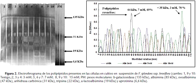 En la condición de cultivo de tejido calloso de Fouquieria splendens ssp. breviflora en medio sólido, el número de polipéptidos evidenciados en los electroferogramas analizados con el densitómetro (Fig. 2), fueron: testigo con 28 (polipéptidos principales de 82 y 48 kDa con 34 y 30,6% de proteína, respectivamente), ABA 10 mM con 10 (polipéptidos principales de 58 y 110 kDa, con 25 y 54,16 % de proteína, respectivamente), ABA 20 mM con 20 (con tres polipéptidos menores a 35 kDa, con 50, 79 y 38, 09 % de proteína) y ABA 30mM con 22 (con tres polipéptidos presentes, uno de 80 kDa y dos menores a los 35 kDa cada uno con 25, 27, 10, 98 y 12, 08 % de proteína, respectivamente). En la condición de cultivo de células en suspensión, el número de polipéptidos evidenciados fue el siguiente: testigo con 14 (con tres polipéptidos principales de 40, 90 y un polipéptido menor a 35 kDa, con 20, 68, 20, 68 y 24,13 % de proteína, respectivamente), ABA 3 mM con 15 (con dos polipéptidos de 43 y uno menor a 35 kDa, con 10,15 y 70, 31 % de proteína, respectivamente), ABA 7 mM con 13 (con dos polipéptidos uno de 64 y otro menor a 35 kDa, con 69, 63 y 19, 89 % de proteína) y finalmente ABA 15 mM con 13 (con tres polipéptidos presentes, uno de 64 kDa y dos menores a los 35 kDa, con 16, 22 y 32 % de proteína, respectivamente).