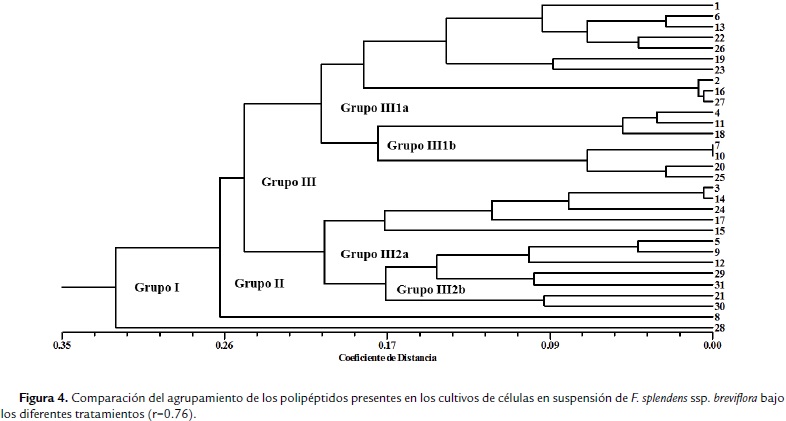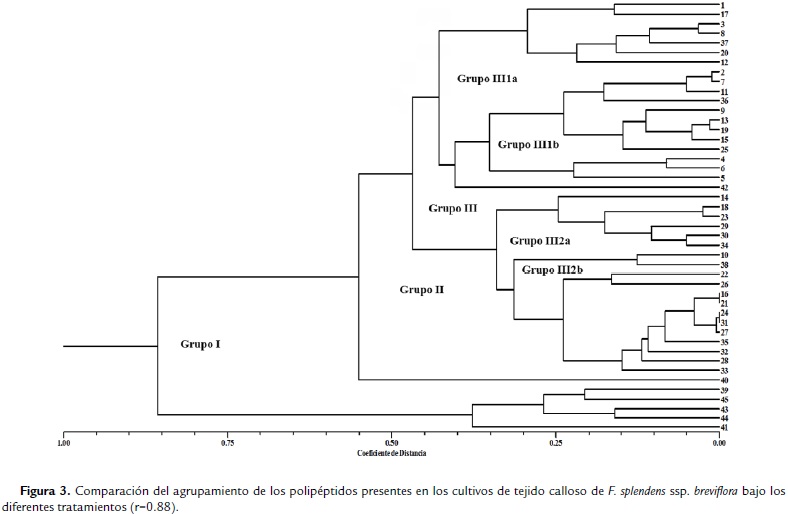 El fenograma de las condiciones de cultivo de callo, muestra dos grupos bien definidos de manera inicial (Grupo I), donde se tiene un polipéptido abundante solamente en los tratamientos testigo y ABA 20 mM, el segundo grupo (Grupo II) que incluye al resto de los polipéptidos analizados, también está constituido a su vez por dos; uno de ellos único por presentarse este polipéptido solamente en el tratamiento con ABA 20 mM, y un Grupo III que agrupa al resto de los polipéptidos con los grupos III 1a y III 1b, que asocia los polipétidos comunes de los tratamientos Testigo y ABA 30 mM y de Testigo y 10 mM, respectivamente. Los Grupos III 2a solamente está constituido por los polipéptidos característicos en los tratamientos ABA 10 y 20 mM y el III 2b con los polipéptidos presentes en el tratamiento con ABA 30 mM. Para los cultivos de células en suspensión, se conformó inicialmente en el fenograma, la distribución de los grupos como sigue: Grupo I, con polipéptidos asociados al tratamiento de las células expuestas a ABA 3 mM, con la mayor concentración de proteína, seguido del Grupo II, que concentra al resto de los polipéptidos evidenciados. Este a su vez tiene un solo grupo constituido por los polipéptidos comunes en los tratamientos Testigo y ABA 3 y 15 mM; y un Grupo III que se asocia en el Grupo III 1a con los polipéptidos presentes en los tratamientos de ABA 3 mM y 7 mM. El Grupo III 1b asocia los polipéptidos comunes en el tratamiento de ABA 15 mM y el Grupo III 2 conformado por III 2a con los polipéptidos comunes de los tratamientos Testigo, ABA 3 y 15 mM, y el Grupo III 2b con los tratamientos Testigo, ABA 7 y 15 mM.