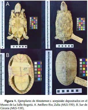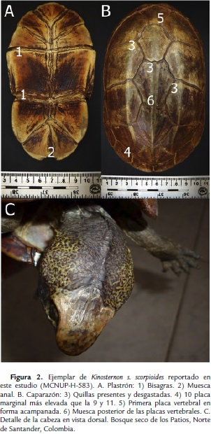 Durante una exploración realizada con el fin evidenciar la presencia de otros grupos en la vereda La Garita, municipio de Los Patios, departamento de Norte de Santander, el 22 de febrero de 2014 (aproximadamente al mediodía), se encontró forrajeando un espécimen vivo de K. s. scorpioides (Fig. 2) en los márgenes del río Pamplonita dentro de un fragmento de bosque seco tropical (Bs-T; 07° 44' 52.1" N, y 72° 34' 17.3" W; 709 m s.n.m., WGS84), el área donde se encontró el ejemplar posee una temperatura entre los 24 y 27 °C con precipitaciones que oscilan entre los 1000 y los 1500 mm anuales. Este nuevo registro se encuentra a 18 km del reporte de 1955 en Cúcuta (MLS-159) y a 42 km del reporte de 1958 en el municipio del Zulia (MLS-190). Con la ayuda de un calibrador digital (precisión ± 0,1 mm) se tomaron las medidas correspondientes (Rueda-Almonacid et al., 2007): largo del caparazón (LCS = 156,43 mm), largo máximo del caparazón (LC Max = 157, 84 mm), ancho de caparazón (AC = 92.42 mm), ancho máximo del caparazón (AC Max = 96.04 mm), largo del plastrón (LPS = 140.82 mm), largo máximo del plastrón (LP Max = 146 mm), altura del caparazón (AC = 50.75 mm), longitud del puente (LP = 22.06 mm), y longitud de la cola precloacal (LCP = 17.23 mm). El individuo registrado en esta nota y los depositados en el Museo de La Salle-Bogotá fueron identificados por los caracteres morfológicos descriptivos del género y la especie en mención (Fig. 1, Fig. 2): presencia de tres quillas en su caparazón, una uña en forma de aguijón presente en la punta de la cola, una muesca pronunciada en el lóbulo posterior (presente sólo en los ejemplares de Suramérica: Rueda-Almonacid et al., 2007), un lóbulo anterior más alargado que ancho y un plastrón articulado en tres partes (central fija y dos móviles, lo que permite encerrarse dentro de su caparazón; Rueda-Almonacid et al., 2007; Trebbau y Pritchard, 2016). Adicionalmente, el individuo colectado presenta un desgaste en las quillas y una concavidad en el lóbulo anterior del plastrón, por lo cual se determinó que era un macho adulto (Barreto et al., 2009). El plastrón tiene una tonalidad café amarillenta, con manchas café oscuro (Fig. 1), mientras que la cabeza presenta dorsalmente una coloración oscura y franjas laterales reticuladas de color amarillento, la escama nasal bastante desarrollada café oscura, la mandíbula superior con una terminación en gancho, y junto con la mandíbula inferior presentan una coloración amarillenta, al igual que la parte ventral de la cabeza y cuello (Fig. 2C). El espécimen fue catalogado con el número de registro MCNUP-H-583 dentro de la colección Herpetológica del Museo de Ciencias Naturales de la Universidad de Pamplona.