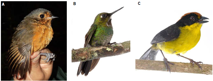 Para el trabajo con redes de niebla se adecuó el lugar y se instalaron, en dos estaciones de muestreo, redes de nueve y 12 metros para un total de 150 metros lineales. Estas permanecieron abiertas en la misma estación de muestreo entre las 05:30-6:00 y las 10:30-1 1:00 AM (cinco horas diarias) durante tres días consecutivos y un esfuerzo de muestreo de 187,5 horas-red por estación de muestreo (donde una hora-red es equivalente a una red de 12 m abierta durante una hora). Al cuarto día las redes fueron trasladadas a la segunda estación de muestro donde se activaron otros tres días. Para cada ave capturada se registraron medidas morfométricas: peso, largo del pico, alto del pico, ancho del pico, longitud del tarso, longitud de las alas y de la cola, utilizando un calibrador, regla metálica y pesolas de 10, 50 y 100 gr. Además se registraron datos del estado del individuo: presencia de parche de incubación, grasa subcutánea acumulada, presencia de muda del plumaje y su estado (Villarreal et al., 2004). Los ejemplares colectados fueron preparados en horas de la tarde y hasta la noche de cada día de muestreo, y se encuentran depositados en la colección ornitológica del Instituto de Investigación de Recursos Biológicos Alexander von Humboldt. También se obtuvieron tejidos de los ejemplares para ser utilizados en estudios moleculares y depositados en la colección de Tejidos del Instituto Humboldt. Para las especies endémicas y casi endémicas seguimos a Chaparro-Herrera et al. (2013), para la taxonomía a Remsen et al. (2017)
