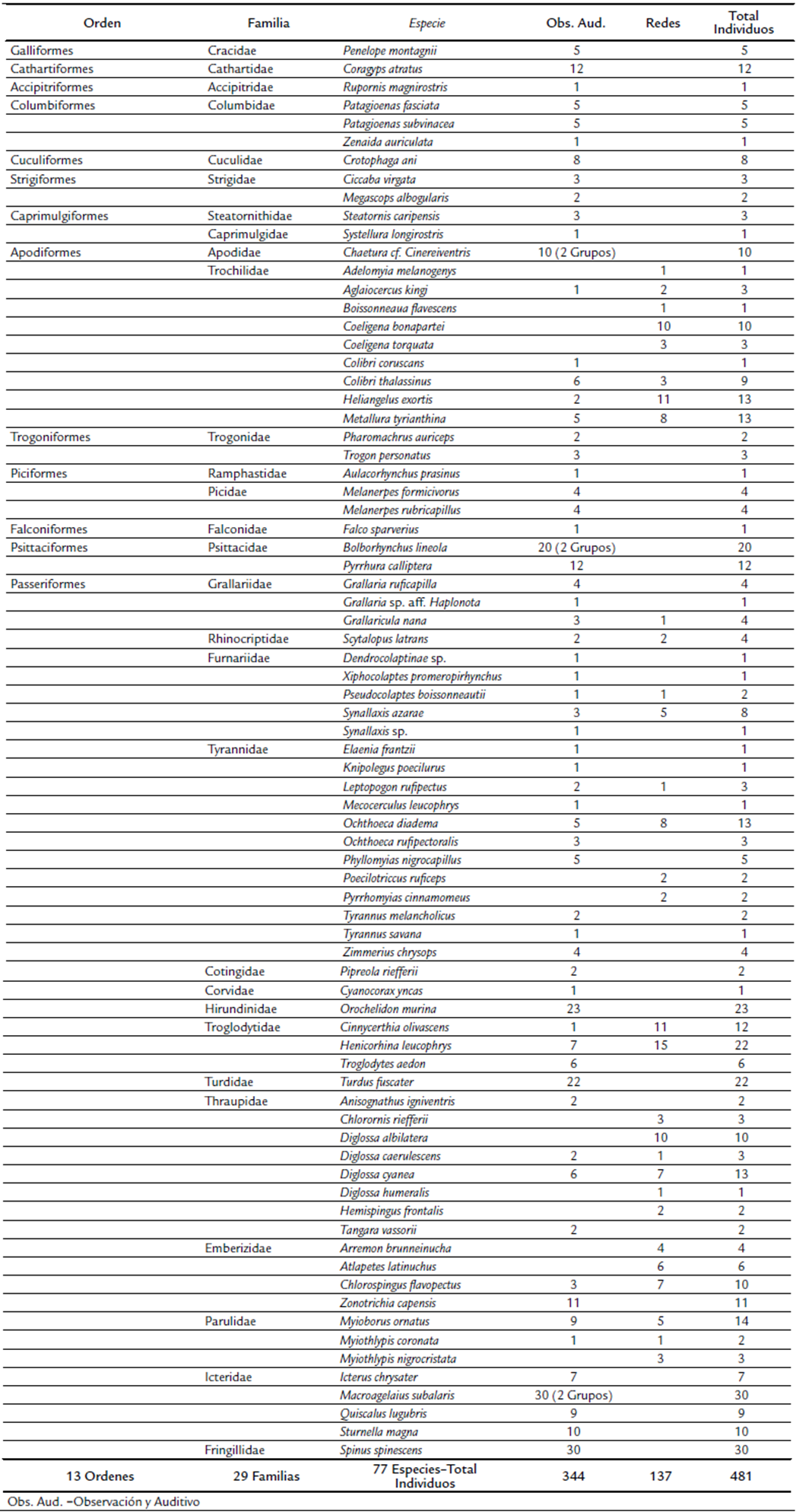 Se registraron 481 individuos de 77 especies de aves, entre capturas con redes, observación y registro auditivo. Las 77 especies pertenecen a 13 órdenes y 29 familias diferentes. La familia mejor representada fue Tyrannidae (Atrapamoscas) con 12 especies seguida por Trochilidae (Colibríes) con nueve especies y Thraupidae (Fruteros, robadores de néctar y afines) con ocho especies (Tabla 1).