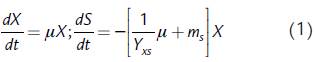 donde X representa la concentración de biomasa, S representa la concentración de la fuente de carbono y j es la velocidad específica de crecimiento; los parámetros de este modelo incluyen el coeficiente de rendimiento celular a partir de sustrato (Yxs ) que representa la cantidad de biomasa celular formada por unidad de masa de sustrato consumido, y el coeficiente de mantenimiento (ms ), los cuales se deben ajustar a partir de los datos experimentales. Esta expresión se ha empleado ampliamente para el modelamiento del crecimiento microbiano (Belfares et al., 1995; He et al., 2008; De Andrade et al., 2013). En la ecuación de velocidad de consumo de sustrato (dS/dt), el término -μX/Yxs describe la utilización de parte del sustrato para formación de biomasa celular, mientras que el término -msX describe la utilización de parte del sustrato para proveer energía para mantenimiento celular y no para crecimiento de biomasa (Pirt, 1965). Las actividades celulares de mantenimiento incluyen regulación osmótica, reparación de las estructuras celulares, re-síntesis de componentes macromoleculares (RNA y proteínas), y mantenimiento de la movilidad (Dawes y Ribbons, 1964).