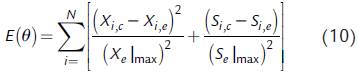 donde N es el número de puntos experimentales, es decir, el número de muestras (N = 19 para los modelos que describen los cultivos empleando el medio basado en melaza, y N = 6 para el medio basado en sacarosa considerando solo los puntos experimentales representados por los modelos propuestos). Para el caso de sacarosa como fuente de carbono, se usaron solo las primeras seis muestras, puesto que los modelos usados no presentan la capacidad de representar toda la curva de crecimiento incluyendo la fase de muerte celular. Adicionalmente, i es el índice correspondiente a cada muestra, Xi,e y Si,e son la concentración experimental de biomasa y de la fuente de carbono, respectivamente, Xi c y Si c corresponden a la concentración de biomasa y de la fuente de carbono calculadas por los modelos de la Tabla 1, respectivamente, Xe|max es el máximo valor de las concentraciones medidas de biomasa, y Se|max es el máximo valor de las concentraciones medidas de la fuente de carbono, y θ es el vector de parámetros del modelo.