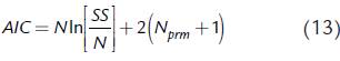 donde AIC está dado por la ecuación (13). El modelo con menor AICc tiene una mejor combinación entre calidad de ajuste y complejidad. En el presente trabajo se decidió usar el criterio AICc en lugar del criterio AIC, considerando que los valores de N son relativamente pequeños. Para aplicar el criterio de Akaike se toman los modelos con mayor calidad de ajuste: dos modelos de cuatro parámetros y dos modelos de cinco parámetros. Los términos SS, AIC y AICc se calcularon por separado para biomasa (AICc ) y para la fuente de carbono (AICcs). Adicionalmente, se aplicó un criterio AICc combinado, el cual emplea la función objetivo de minimización de los residuos E(θ) dado por la ecuación (10) en lugar del término SS. De esta forma, se evita tener AICc por separado para biomasa y para la fuente de carbono.