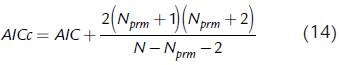 donde N es el número de datos experimentales, Nprm es el número de parámetros a ser ajustados y SS es la suma de los cuadrados de las diferencias entre los datos experimentales y los datos obtenidos con el modelo. El modelo con menor AIC tiene una mejor combinación entre calidad de ajuste y complejidad. Cuando la muestra es pequeña, de modo que N es pequeño en comparación con Nprm , el valor de AIC es muy pequeño, dando como resultado que el criterio AIC sugiere como más apropiados los modelos que tienen muchos parámetros, lo cual implica sobreajuste (Mutolsky y Christopoulos, 2003). Con el fin de corregir este fenómeno fue desarrollado el criterio AICc, que es una versión corregida del criterio de Akaike (Hurvich y Tsai, 1989):