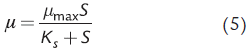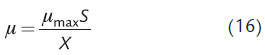donde μmax es la máxima velocidad de crecimiento específico y Ks es el parámetro de saturación por sustrato, también definido como la concentración de sustrato a la cual la velocidad j es igual a la mitad de μmax .Por su parte, la ecuación de Contois (Contois, 1959; Birol et al., 2002; Vatcheva et al., 2006) tiene en cuenta el efecto de inhibición debido a la biomasa: