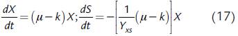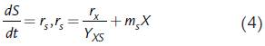 La segunda ecuación de las expresiones (3) se puede presentar de tal forma que se visualice el consumo de sustrato tanto para la formación de nueva biomasa, como para el mantenimiento celular (Pirt, 1965; Wang y Post, 2012; De Andrade et al., 2013):