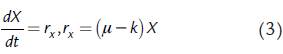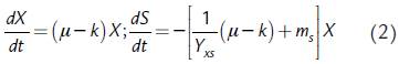 donde k es el coeficiente de metabolismo endógeno y ms es el coeficiente de mantenimiento. La expresión de velocidad de formación de biomasa (rx) se compone de un término que corresponde a las biosíntesis de células nuevas empleando las fuentes de energía y de carbono del medio (en este caso, estas fuentes coinciden) y de otro término que representa el proceso mediante el cual la biomasa misma se emplea como fuente de energía y carbono para su superviviencia (metabolismo endógeno); cuando el sustrato se agota, el componente de destrucción de las células (-kX) excede al de su síntesis (μX) lo que conlleva a una disminución de la concentración de biomasa (Herbert, 1959; Dawes y Ribbons, 1964):