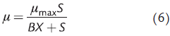 donde μmax es la máxima velocidad de crecimiento específico y B el coeficiente de crecimiento de la expresión de Contois. La ecuación de Contois es una variante del modelo de Monod, en la cual la velocidad específica de crecimiento es inhibida por la concentración de biomasa X (Vatcheva et al., 2006).