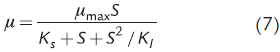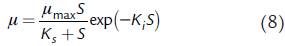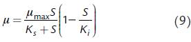donde Kl es la constante de inhibición relacionada con el sustrato S. Para estos fines también se ha aplicado la siguiente expresión (Aiba et al., 1968; Luong, 1987; Niu et al., 2016):
