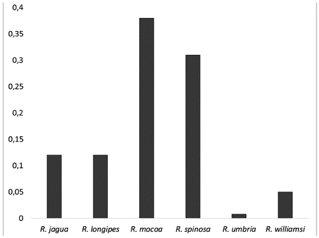 En los tres municipios bajo estudio se recolectaron 710 especímenes agrupados en seis especies del género Rhagovelia, pertenecientes a los grupos bisignata y robusta. Los valores obtenidos de los índices de diversidad, con intervalo de confianza del 95 %, fueron: Shannon Wiener: 1,43; Simpson: 3,61 y el de Margalef: 0,76. Las especies más abundantes (Fig. 2) fueron R. mocoa (0,38), con el 38 % de los ejemplares capturados y R. spinosa (0,31), con el 31 %; Rhagovelia umbria (0,008) fue la especie con menor abundancia 0,8 %.