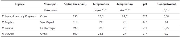 La mayoría de especies (cinco de seis) se ubicaron en un rango altitudinal entre los 300 a 400 m s.n.m; sólo R. mbria se encontró a los 390 m s.n.m; y sólo dos especies alcanzaron los 620 m s.n.m: R. jagua y R. mocoa.