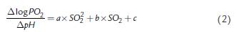 Donde n es la pendiente, K el valor de logPO2 cuando SO2 es igual a 50 %, es decir el logaritmo en base 10 de la presión parcial de oxígeno que genera el 50 % de la saturación (P50). Para establecer el diagrama de Hill, una regresión lineal fue calculada de acuerdo con el siguiente procedimiento. Los valores de PO2 para niveles fijos de saturación desde 10 hasta 90 % fueron establecidos por interpolación. Del mismo modo, los valores de pH medidos para cada saturación se interpolaron para los niveles de saturación de 10 a 90 %. A partir de las diferencias entre logPO2 y las diferencias de pH para cada nivel de saturación entre las ODC para 6 y 12 % CO2 fueron calculados los coeficientes de Bohr (Dlog PO2 /DpH). Para esta relación se calculó la siguiente regresión cuadrática: