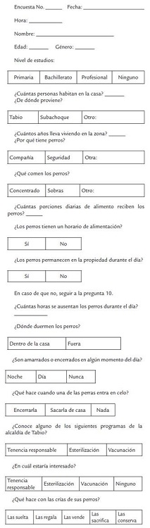 Se visitaron 36 casas con perros, logrando hacer 33 entrevistas efectivas. Con lo que se encontró un total de 84 perros en las casas, y se obtuvo información de 73 de ellos; con un promedio de 2 ± 1,4 perros por casa. Según lo dicho por los dueños, ningún perro recibe comida insuficiente, concordando con que ninguno mostraba rasgos aparentes de desnutrición.
