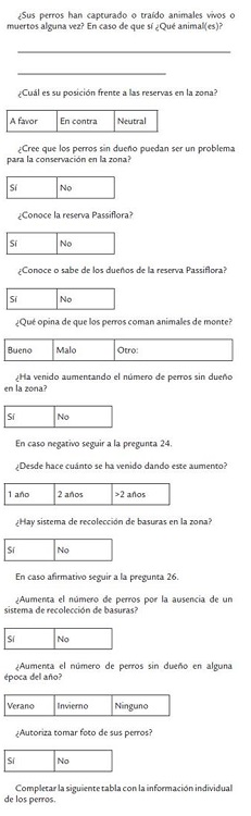 Además, se realizaron 33 encuestas, semi estructuradas (Anexo 1), a dueños de perros del área rural circundante a la zona de reserva, en un radio de 500 m, con el propósito de identificar los perros presentes y compararlos con los registros de las cámaras trampas; entender el punto de vista de los dueños sobre los esfuerzos de conservación y el impacto de los perros en las reservas.