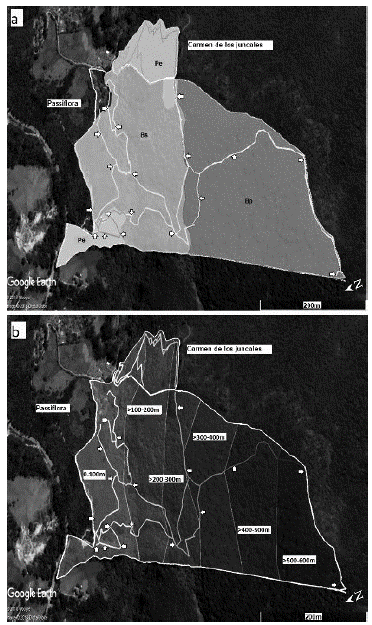 Al interior del área de estudio se presentan las coberturas vegetales de bosque andino conservado (Representado por Anthurium sp., Weinmannia tomentosa, Macleania rupestris, Cavendishia sp., Smilax sp., Drymis granadensis, Clusia multiflora, helecho lengua de venado (Phyllitis scolopendrium) y algunas Cyperaceae), bosque andino secundario (Representado por Piper bogotensis, Cedrela montana, Palicourea sp., Miconia sp., Bocconia frutescens, Rubus sp., algunos individuos de Oreopanax floribundum y Alnus acuminata), y zonas de plantas exóticas (principalmente eucalipto (Eucalyptus obliqua)) (Fig. 1a); las cuales fueron identificadas durante las caminatas utilizando la descripción de las mismas previamente reportadas en la reserva Passiflora y alrededores (Padilla, 2010; Agredo et al., 2013; Álvarez y López-Arévalo, 2013; Liévano y López- Arévalo, 2014).