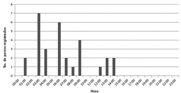 Se puede apreciar en la Fig. 3 que el número de registros de perros al interior del área de conservación es mayor entre las 3 am y 6 am; extendiéndose hasta las 9 am, sin que se registre más de dos avistamientos después de esta hora, y ninguno después de las 3 pm (Fig. 3). Aparte de los perros se avistaron dos individuos de Didelphispernigra con las cámaras trampa, uno en la zona de plantas exóticas cerca a la entrada de la reserva Passiflora y el otro en bosque secundario; un individuo de Arremon assimilis en bosque secundario con las cámaras trampa; y un individuo de Nasuella olivacea durante un recorrido de la reserva Passiflora, en bosque secundario.