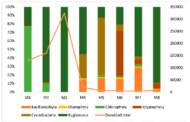 El análisis de Kruskal-Wallis mostró diferencias significativas (p <0,05) a nivel temporal en la composición y estructura de la comunidad fitoplanctónica. Los muestreos realizados en septiembre (M1), octubre (M2) y noviembre (M3) presentaron las mayores densidades poblacionales, siendo noviembre el que presentó una mayor densidad de algas (324 400 individuos/ml). En septiembre, Actinastrum hantzchii fue la especie dominante, mientras que para octubre y noviembre fueron Lepocinclis ovum y Trachelomonas volvocinopsis. A partir del cuarto muestreo las densidades disminuyeron, siendo diciembre (M4) el que presentó la mayor densidad (18 908 individuos/ml) con respecto a enero (M5), febrero (M6) y abril (M8); marzo (M7) presentó la menor densidad de algas (3 683 individuos/ml) durante todo el estudio. Las densidades en estos muestreos fueron bajas que no se observaron especies con una densidad relativa mayor al 1 %.