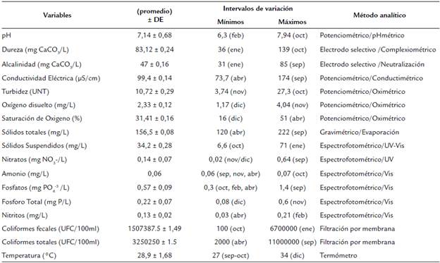 Las variables relacionadas con procesos de oxido-reducción (nitratos, nitritos, fosfatos, fósforo total y amonio), presentaron concentraciones más altas en los meses de septiembre, octubre y noviembre en general. Las mayores concentraciones de nitratos se presentaron en septiembre y octubre (0,64 y 0,24 mg/L, respectivamente). El amonio fue estable durante los muestreos (0,06 mg/L) con excepción de octubre (0,07 mg/L). Los fosfatos presentaron el mayor valor en septiembre (1,4 mg/L) y los menores registros en febrero, marzo y abril (0,3 mg/L). En octubre y noviembre se registraron los valores más altos de fósforo total (0,5 y 0,6 mg/L) mientras que diciembre presentó el menor valor con 0,08 mg/L. Los nitritos presentaron los mayores valores en enero y febrero (0,16 y 0,21 mg/L, respectivamente); sin embargo, su concentración fue similar a lo largo de los muestreos.