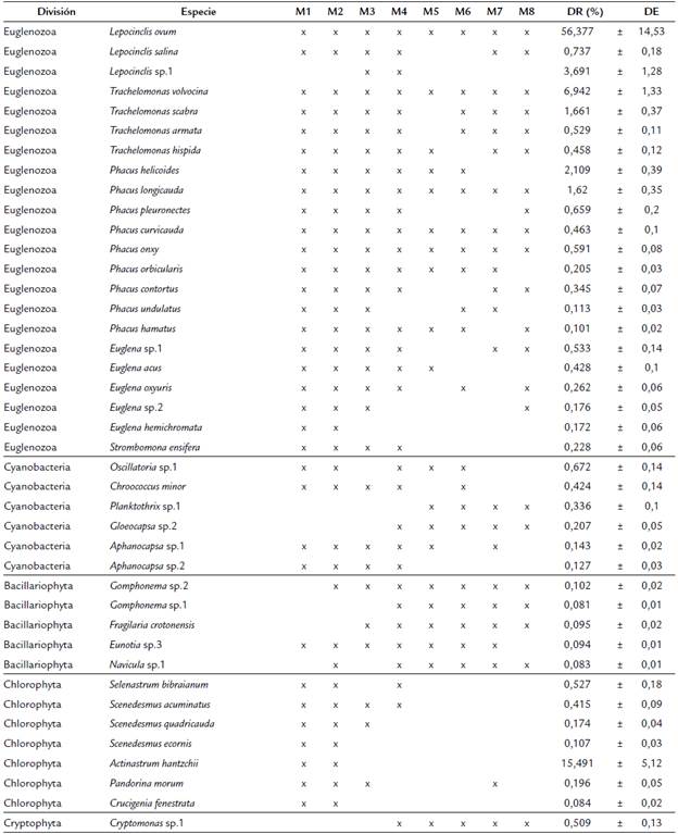 Lepocinclis ovum fue la especie con mayor densidad de la comunidad fitoplanctónica con 369 125 individuos/ ml (56,47 %), seguida de Actinastrum hantzschii con 101 425 individuos/ml (15,51 %), Trachelomonas volvocinopsis con 45 450 individuos/ml (6,95 %), Lepocinclis sp.1 (24 166 individuos/ml), Phacus helicoides (13 808 individuos/ ml), Trachelomonas scabra (10 875 individuos/ml) y Phacus longicauda (10 608 individuos/ml). Las demás especies en conjunto se denominan raras y representaron menos del 20 % de la comunidad fitoplanctónica presente en el humedal. Las especies que presentaron una densidad relativa menor a 0,01 % fueron en su mayoría clorofíceas (Closterium acerosum, Cl. aciculare, Cl. turgidum, Cl. venus, Cosmarium baileyi, Co. maculatum, Co. margaritatum, Co. phaseolus y Micrasterias laticeps, entre otras) (Tabla 2).
