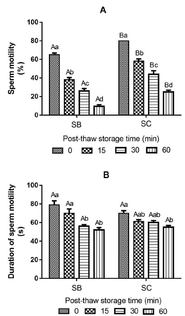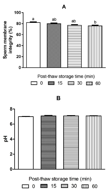 To evaluate the effect of post-thaw storage time (PST) and activator solution on the quality of P. orinoquensis cryopreserved semen, a completely randomized design was used in a 2 x 4 factorial arrangement consisting in two activating substances (1 % NaHCO3 [SB, 185 mOsm kg-1] and 0.9 % NaCl [SC, 308 mOsm kg-1]) and four PST (0, 15, 30 and 60 min). Sperm motility (%), duration of motility (s), and fertility (%) were taken as response variables. For variables sperm membrane integrity - SMI (%) and pH, a randomized arrangement was implemented, under the same four times described above. Three macrotubes were thawed per male (total = 15).