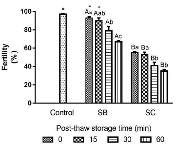 PST significantly affected sperm integrity after 60 min. The progressive reduction in sperm quality during PST can be attributed to instability caused by alterations in the cell membranes because of freezing and thawing processes (Viveiros et al., 2017, 2019). Cryopreservation causes loss of membrane fluidity due to the rigidity of the lipids during cooling in addition to the denaturation of the proteins, resulting in disruption of transmembrane transport and ion exchange. In addition, it generates ruptures that affect the conformation of the cytoskeleton, reducing the ability to the union between the sperm and the oocyte in the thawed semen (Karow, 2001). Moreover, the cryogenic effect can damage membranes of organelles such as mitochondria, affecting the availability of ATP for sperm movement (Figueroa et al., 2019), a situation that would partially explain the impaired motility and reduced fertilization capacity during PST. In all PSTs, the pH tended to be neutral (7.0), being a favorable characteristic for seminal quality after defrosting. Although sperm motility and fertility were significantly reduced by PST, fertilizing capacity remained at acceptable values after 60 min when sperm motility was activated with SB 1 %. SC 0.9 % allowed the activation of sperm motility of cryopreserved semen; however, fertility tests were not satisfactory as those obtained with SB.