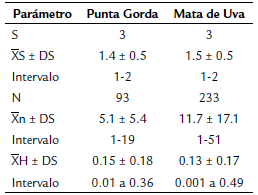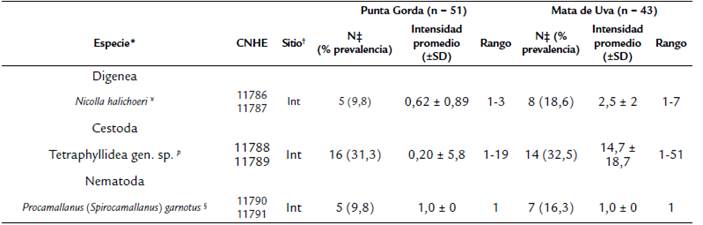 Se examinaron 51 especímenes H. bivittatus de Punta Gorda (PG), con una longitud total de 3,6 a 10,5 (promedio 6,7 ± 1,7) cm y peso de 1,0 a 15,0 (promedio 4,6 ± 3,5) g, y 43 especímenes de la misma especie de Mata de Uva (MU), con longitud total de 4,5 a 11,0 (promedio 7,3 ± 1,6) cm y peso de 2,0 a 15,0 (promedio 5,4 ± 3,2) g. En total, se recolectaron 326 helmintos (93 en PG y 233 en MU), se identificaron para ambos sitios tres especies: un digéneo Nicolla halichoeriOverstreet, 1969 (Digenea: Plagiorchiida: Opecoelidae), una larva de céstodo del Orden Tetraphyllidea y un nemátodo Procamallanus (Spirocamallanus) garnotus Bashirullah et Williams, 1980 (Nematoda: Rhabditida: Camallanidae).