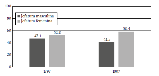 Al final del periodo colonial, los hogares eran predominantemente liderados por mujeres. La gráfica 1 muestra que en 1797, 52.8% de las jefaturas era femenina y estas aumentaron a 58.4% en 1807. Como anotamos al inicio, en una sociedad patriarcal como la caleña era muy difícil que una mujer accediera a la jefatura, a menos que el marido o compañero no viviera en el hogar o no se hubiera encontrado pareja. Por ello, la alta frecuencia de jefatura femenina pudo haberse relacionado con diferentes factores demográficos, entre los que están una alta mortalidad de los varones y la emigración masculina por razones de trabajo hacia las zonas rurales de la región, además de las limitaciones sociales y políticas para el cruce interracial.