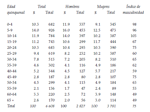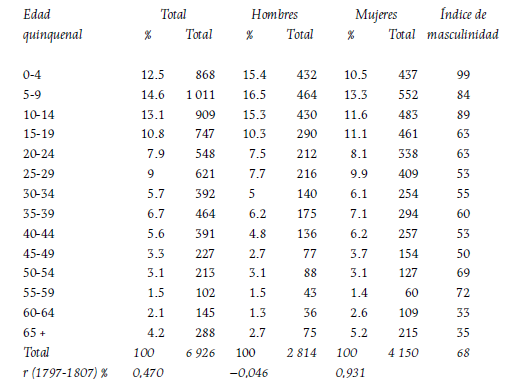 Una inspección a la estructura por edad y sexo de la población caleña en 1797 (en anexo A) nos permite apreciar que sólo 17% de los varones tenía 40 o más años de edad, mientras que 22% de las mujeres tenían estas edades, lo cual sugiere una más alta mortalidad masculina, posiblemente ligada a los riesgos de trabajo. Si a esto añadimos la mayor edad promedio de los hombres casados que de las esposas,25 entonces podemos concluir que la mayor sobrevivencia de las mujeres y, en particular de las esposas, es un factor que interviene en el alto nivel de jefaturas femeninas.