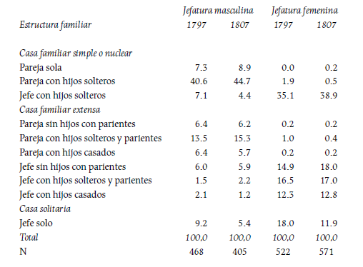 El cuadro 1 confirma que las jefaturas femeninas de 1797 y 1807 se con- centraron principalmente en aquellos arreglos familiares en los que el marido o compañero estaba ausente. Esto se observa en los hogares nucleares y extensos; en cambio, las jefaturas masculinas se concentraron en el arreglo familiar de pareja e hijos solteros. De 1797 a 1807 las jefas solas con hijos solteros aumentaron de 35.1 a 38.9% durante el periodo, así como las jefas que sólo residían con parientes de 15 a 18%, mientras que disminuyeron las jefas en casas solitarias de 18 a 12%. De manera que las jefas a finales de la era colonial tendieron más a llegar a la jefatura en hogares nucleares formados por madres con hijos y en los hogares extensos sin hijos pero acompañadas de parientes.24