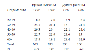 En el cuadro 2 también se observa un aumento en la concentración de jefas en las edades de 30 a 49 años de 1797 a 1807. Esto nos habla de un patrón mixto de jefas en el que, por un lado, se incrementaron las jefas adultas con hijos a medida que se colapsaba el régimen colonial y, por otro, las jefas de edad mayor y posiblemente con necesidad de intercambio de apoyos con los parientes.
