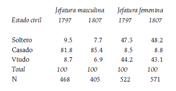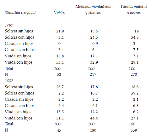 En cuanto al cambio de 1797 a 1807 en la distribución de las jefas por estado civil y maternidad, entre las jefas nobles se incrementaron las solteras sin hijos, lo cual sugiere que las nobles, a pesar de ser idóneas para el matrimonio (Bermúdez, 1992), encontraron dificultades para encontrar esposos de la misma calidad. Esto podría estar vinculado al mayor control que la corona impuso sobre los matrimonios con “desiguales” a finales del siglo xviii.26