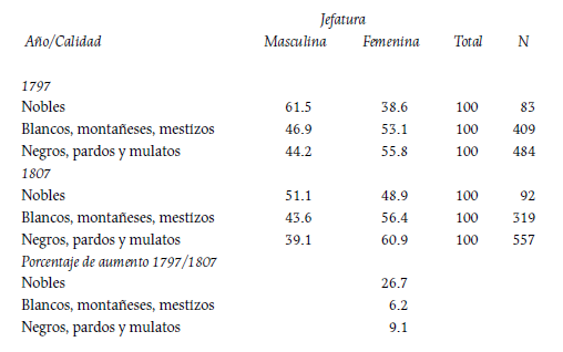 Aun con el aumento de jefas entre las nobles, para 1807 las jefaturas femeninas siguieron siendo más comunes entre las casas de las calidades de ascendencia negra, donde seis de cada diez casas eran lideradas por una mujer. Entre 1797 y 1807, las madres solteras se incrementaron notablemente entre las jefas de ascendencia negra y el número de hijos corresidentes también aumentó entre estas. Si bien se puede argumentar que los maridos o compañeros de estas madres solteras no estaban en el hogar porque trabajaban en las haciendas o las minas, una explicación complementaria al incremento de las jefaturas femeninas en este grupo sociorracial es la dificultad que tenían las mujeres para formalizar sus uniones conyugales con hombres de otro grupo sociorracial, así como el abandono al que las madres solteras posiblemente eran sujetas debido a las condiciones en las que se llevaban a cabo sus uniones.