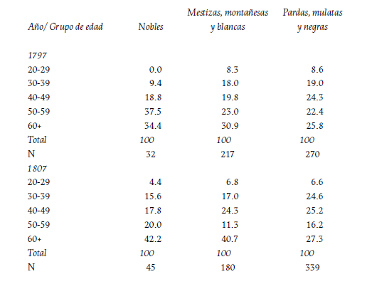 En cuanto al comportamiento por edad de las jefas entre 1797 y 1807, es evidente el incremento de las jefas de 60 años y más en todos los grupos sociorraciales, especialmente entre las nobles y el grupo de blancas, montañesas y mestizas. Además, es notorio un segundo aspecto, mucho más importante en términos de cambio porcentual entre las nobles y las mujeres de las castas: el aumento de las jefas de edades intermedias. Entre las nobles, las jefas de 30 a 39 años de edad pasaron de 9.4 a 15.6% y las jefas de ascendencia africana del mismo grupo de edad ascendieron de 19 a 24.6%. Esta mayor proporción de jefas de edades intermedias sugiere la presencia de otros factores, además de la mortalidad de los maridos o compañeros, en el acceso a la jefatura femenina en estos grupos sociorraciales.