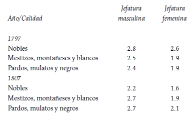 En el cuadro 4 se presenta la distribución de las jefaturas de hogar por sexo y calidad sociorracial en 1797 y 1807. Se observa que las casas de nobles eran mayoritariamente encabezadas por hombres en 1797, mientras que las casas de los otros grupos sociorraciales eran comúnmente encabezadas por mujeres. Esto nos permite apoyar la idea de que entre los nobles era muy importante mantener el sistema patriarcal, el cual aseguraba la transmisión del linaje y la riqueza. En cambio, en los otros grupos la frecuencia de uniones en el marco de la ilegitimidad pudiera haber incidido en la alta incidencia de jefaturas femeninas.