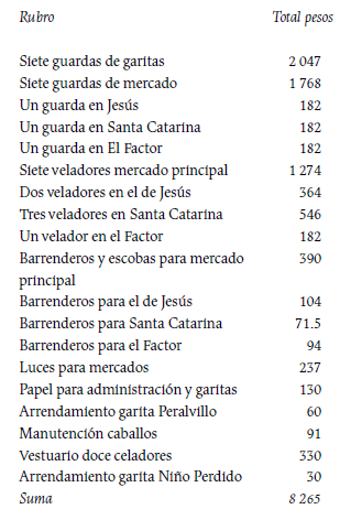 La administración de las plazas y los mercados evidencia lo complejo que debió resultar para la municipalidad organizar el comercio en la ciudad, no sólo su cobranza, sino también mantener el orden de las sombras. Nuestras pesquisas demuestran que la venta de alimentos y otros productos de consumo cotidiano se mantuvo constante dentro y fuera de las plazas de la ciudad, y fue justo el incremento de este comercio urbano lo que orilló a la municipalidad a comisionar esta tarea bajo una contrata.