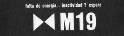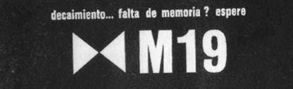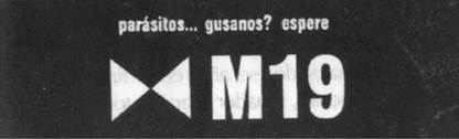 A comienzos de 1974 aparecieron los primeros avisos publicitarios que hacían alusión al M-19; estos se publicaron en cines, en páginas interiores, clasificados y páginas sociales, tenían un fondo negro y en letras blancas se leía: “Ya llega M-19”, “Parásitos... gusanos? Espere M-19”, “Decaimiento... falta de memoria? Espere M-19”, “Falta de energía... inactividad? Espere M-19”. Y al lado de las siglas M-19 dos triangulitos que daban la apariencia de corbatín, como se puede apreciar en las imágenes 1, 2 y 3.