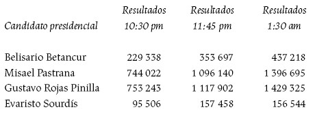 El 20 de abril, al otro día del debate electoral, los reportajes periodísticos aún eran ambivalentes, pues, según los datos de la Registraduría, Misael Pastrana tenía una pequeña mayoría. La ambivalencia se pudo apreciar en las primeras páginas de los periódicos que presentaron al ganador desde ópticas distintas: El Siglo publicó: “Rojas a la cabecera en cómputos electorales. Amplía su mayoría en centros urbanos”, con lo cual le daba el triunfo a Gustavo Rojas Pinilla, aludiendo a los resultados emitidos a las 11 de la noche; periódicos como El Colombiano, La Patria, El País, y otros, también dudaron sobre la publicación de los resultados. En el cuadro 1 se muestran los resultados electorales publicados hasta antes de la medianoche.
