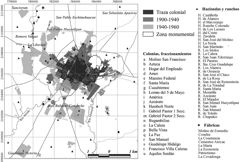 Con una localización estratégica entre la capital virreinal, el Golfo de México y el sureste del país, un poblamiento inicialmente denso y una economía próspera, llegó a ser la segunda ciudad del país durante los siglos XVII y XVIII (Lomelí, 2010). Erigida a los pies de la Sierra Nevada y del volcán de la Malinche, sobre la llanura lacustre en la cuenca del río Atoyac que, junto con el río San Francisco acunaron la traza original. Desde un inicio, la ciudad estuvo dividida entre una traza central ocupada por españoles y barrios indígenas en la periferia, lo que facilitó el control social. Para fines del siglo XIX esa división se reproducía en nuevos barrios para los sectores altos y grupos de extranjeros, por un lado, y barrios populares, por el otro.