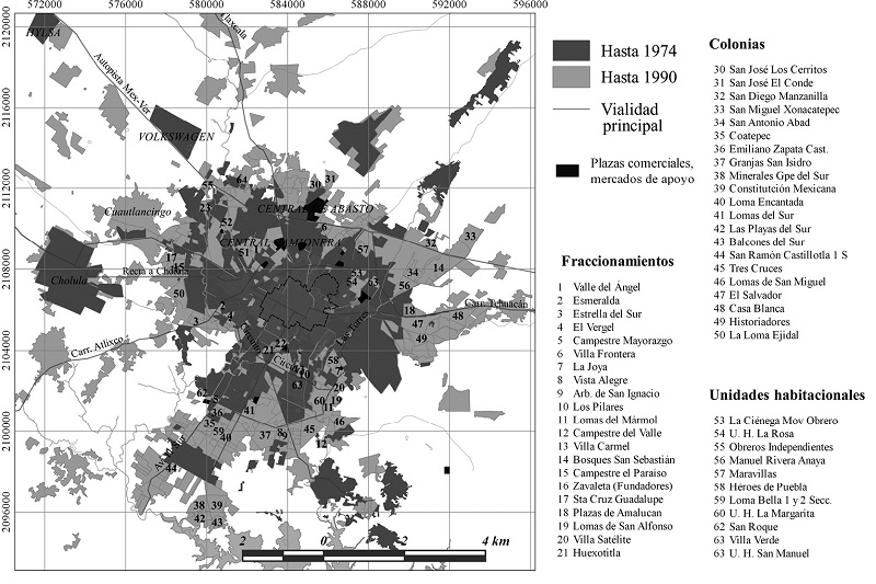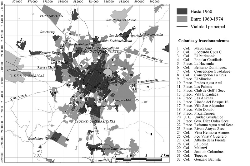 Los nuevos fraccionamientos,5 incluso los que operaban dentro del mercado formal, rompieron la regularidad espacial, aprovechando vialidades primarias como la 11 Sur, Boulevard Valsequillo y la 16 de Septiembre. Construidos sobre el trazo de antiguos caminos que conectaban la ciudad con haciendas, fábricas y fraccionamientos, se convirtieron en ejes de estructuración del espacio suburbano primero y metropolitano después (Melé, 1994).