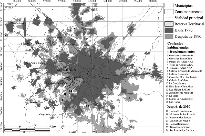 En este periodo se promulgaron numerosos instrumentos de planeación22 para abordar problemas urbanos particulares mediante la desincorporación de funciones estatales y redefinición de roles de los agentes involucrados en la urbanización. Ello se hizo, sin embargo, sin una perspectiva metropolitana y gracias a algunas de esas medidas los promotores inmobiliarios pudieron ocupar tierra social desde la lógica del mercado. Son los casos del Plan de Desarrollo Regional Angelópolis de 1993, que incluyó el proyecto de las reservas territoriales Atlixcáyotl y Quetzalcóatl; la reforma a la Ley de Fraccionamientos en 1997 y la publicación de la Ley de Fraccionamientos y Acciones Urbanísticas del Estado Libre y Soberano de Puebla en 2004.