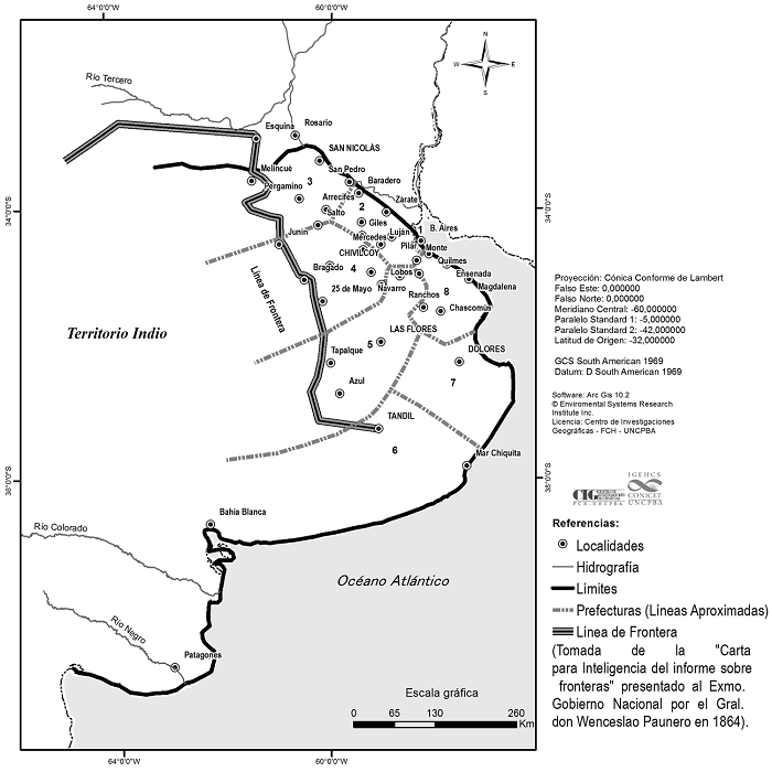 Los límites de las jurisdicciones son estimativos dado que entonces no estaban claramente definidos.9 Una situación similar se planteó con la llamada línea de frontera -así denominada en el mapa original- que estaba lejos de representar la división entre el espacio controlado por las autoridades de la provincia y aquel dominado por las parcialidades indígenas. Diversos estudios mostraron que se trató de un espacio de convivencia entre indígenas, criollos e inmigrantes. Una coexistencia donde el conflicto en diversas manifestaciones no estuvo ausente, pero que nunca implicó el fin de las relaciones personales, políticas y comerciales establecidas y consolidadas en dicho ámbito (Yangilevich, 2009). La escasa precisión de los límites entre jurisdicciones corría paralela con el estado de provisionalidad que atravesaba diferentes iniciativas institucionales. Por ello, en la nueva ley de prefecturas se sostuvo que los departamentos se formarían “por ahora” con los partidos existentes. Uno de los aspectos esenciales de la disposición residía en el nombramiento de los prefectos a cargo del gobierno provincial. La designación se realizó en hombres considerados como leales. Así se procuraba establecer una autoridad que pudiera sobreponerse a la de los jueces de paz.