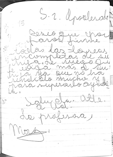 Por otra parte, hay otro tipo de archivos que, si bien no están creados por niños, son de sumo interés por el modo en que permiten delimitar un territorio escolar en un determinado tiempo histórico; nos referimos, por ejemplo, a las libretas de comunicación (libreta para la comunicación escrita entre padres y profesores) y a los informes de personalidad (material en general poco usado para la reconstrucción de la historia de estas instituciones) (véase imagen 10):